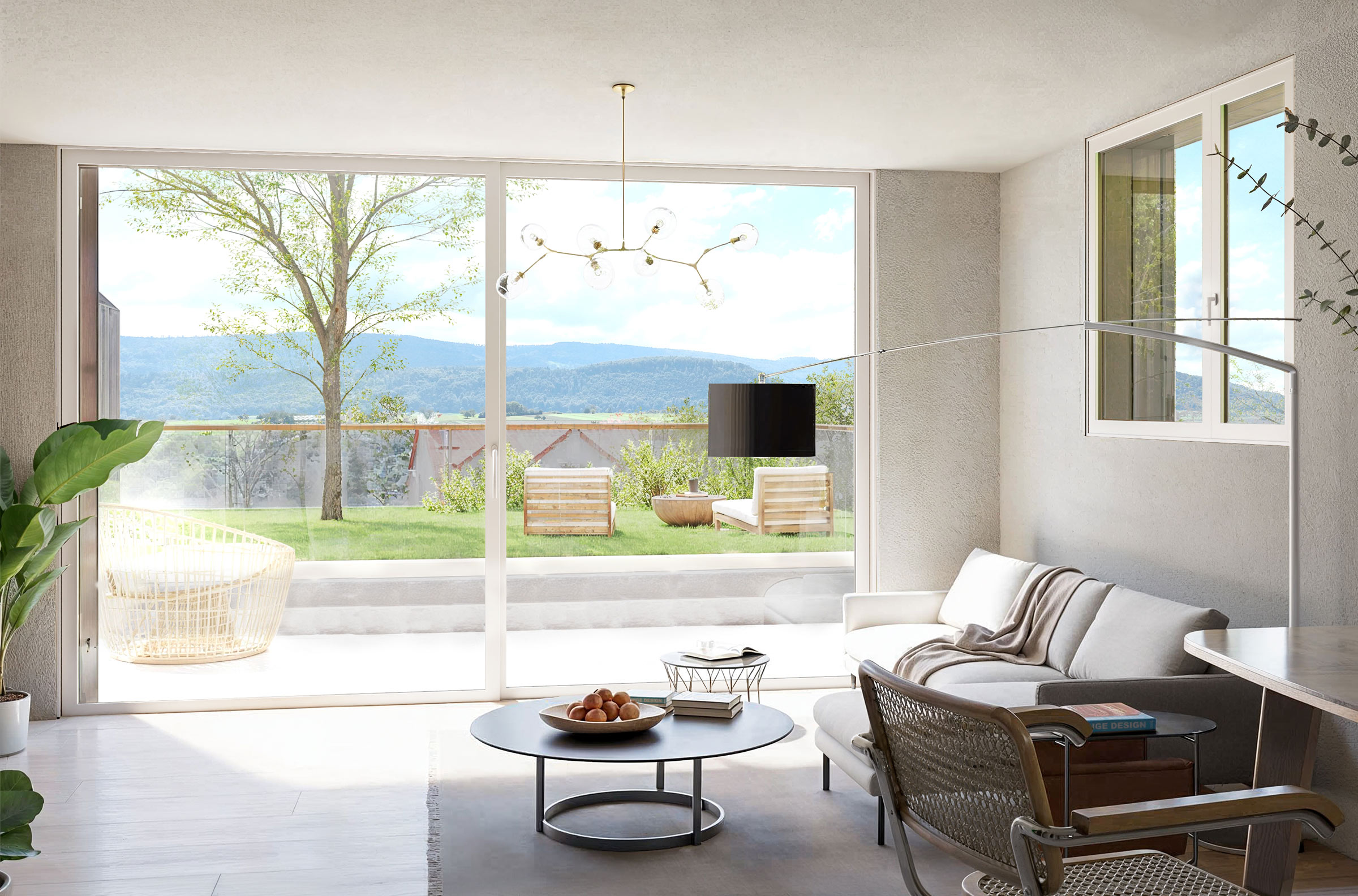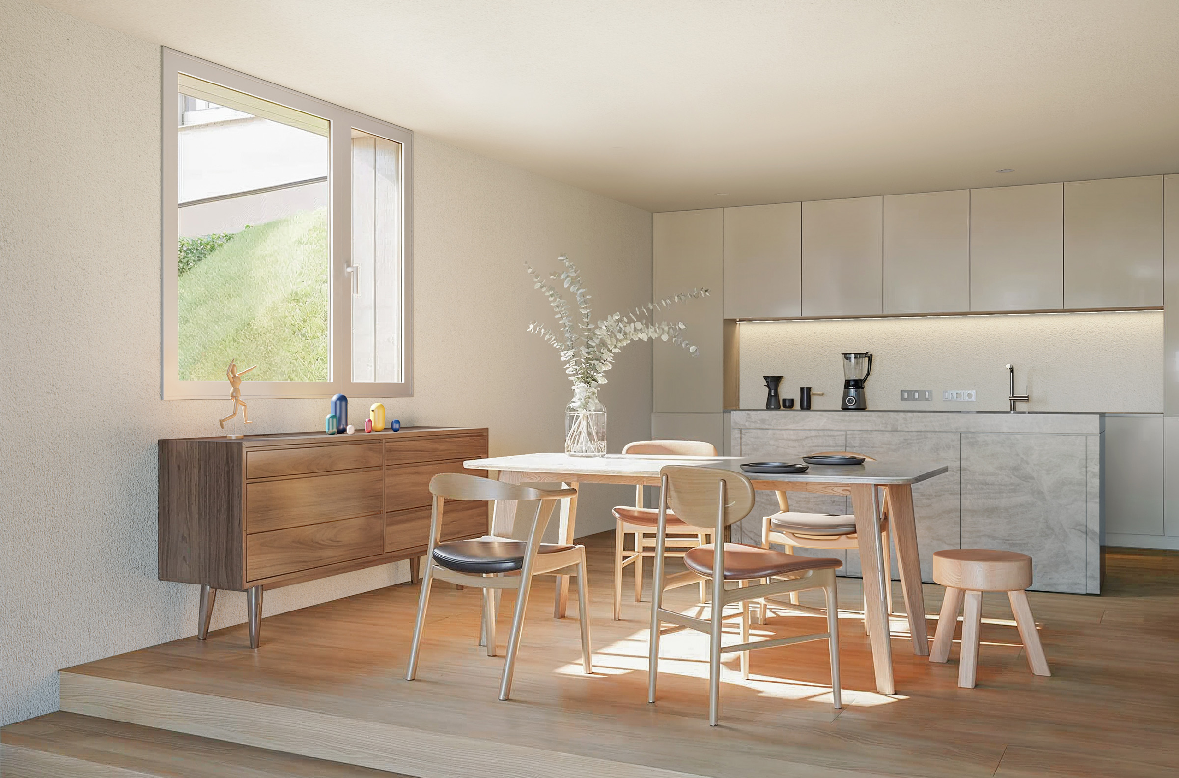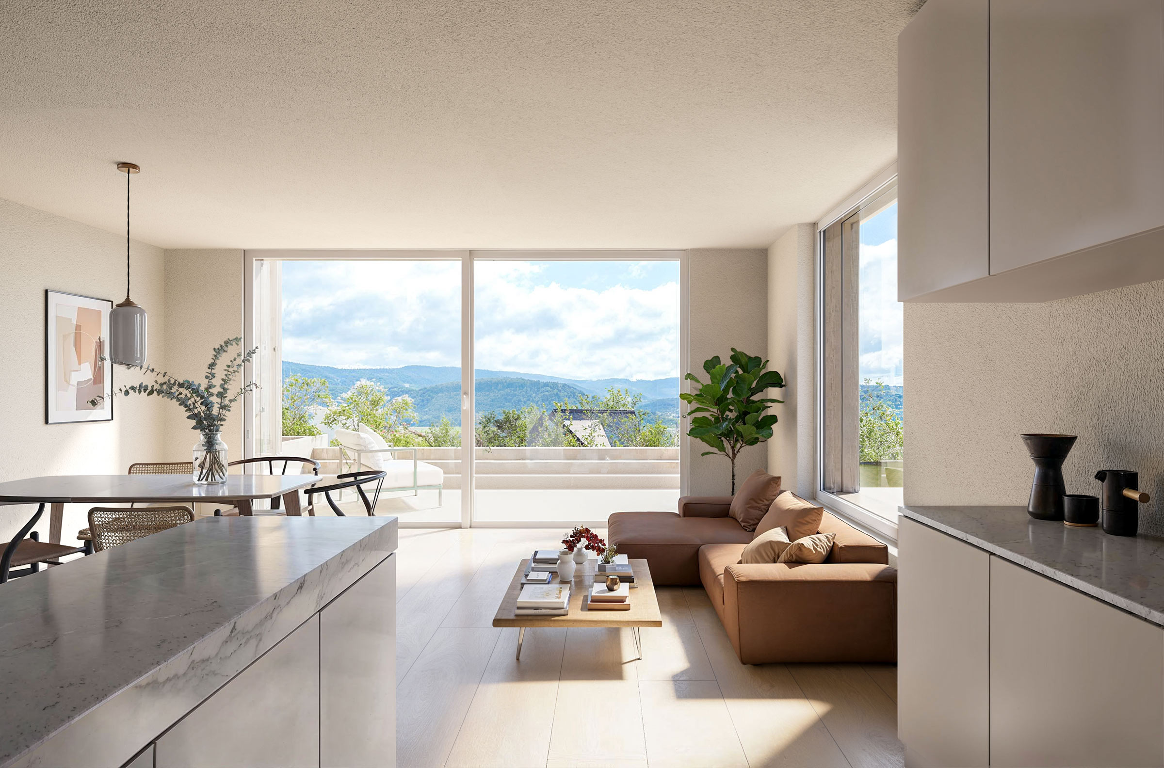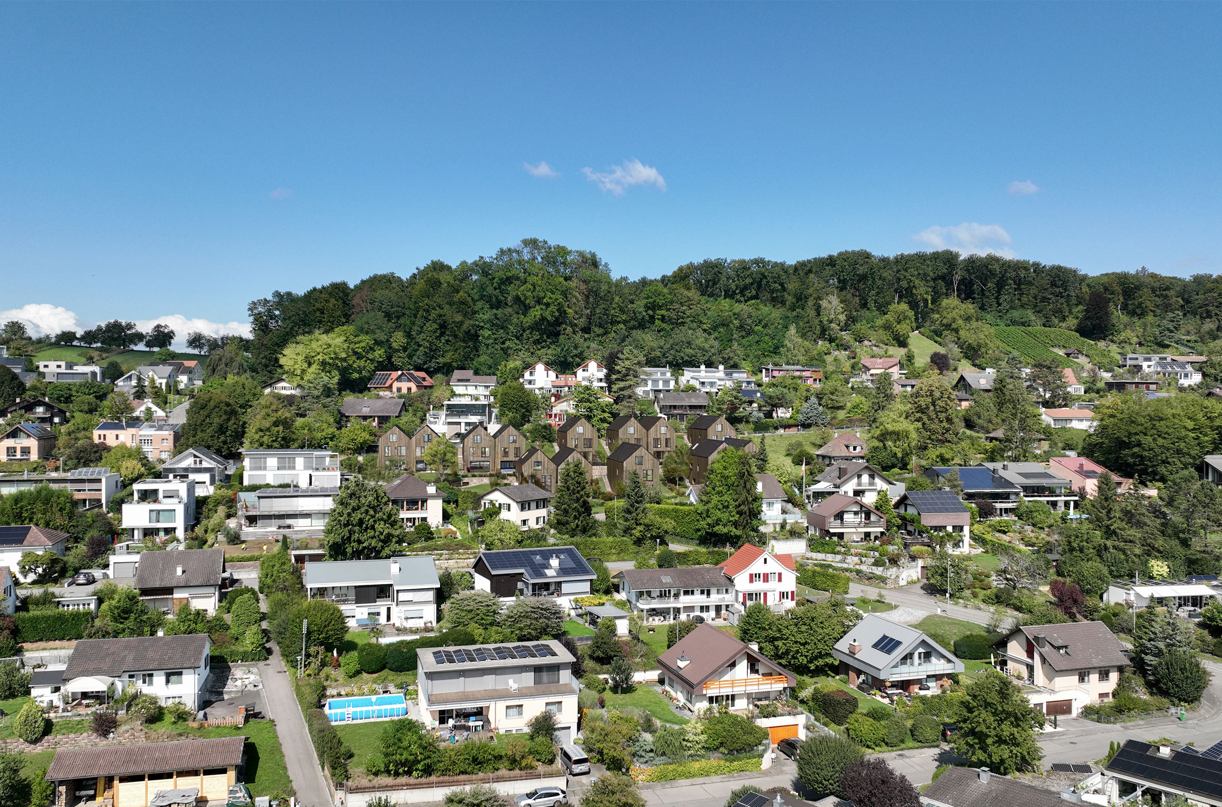 Das Konzept legt großen Wert auf Nachhaltigkeit und Energieeffizienz. Die Dächer sind mit Photovoltaik-Anlagen ausgestattet, die zur Energiegewinnung beitragen und den ökologischen Fußabdruck des Projekts verringern. Zusätzlich wird das Projekt durch Erdsonden unterstützt, die eine umweltfreundliche und effiziente Energieversorgung gewährleisten. Diese Maßnahmen bieten den Bewohnern nicht nur ein zukunftsorientiertes, umweltfreundliches Zuhause, sondern fügen das Projekt harmonisch in die natürliche Umgebung ein. Die Kombination aus nachhaltigen Baumaterialien und energieeffizienten Technologien stellt sicher, dass ökologische Verantwortung im Vordergrund steht.